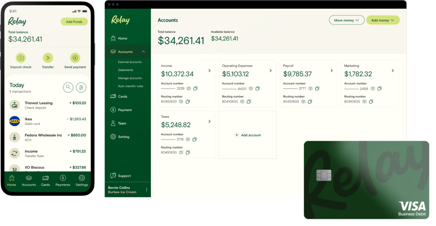 Relay is a small business banking platform built around visibility and control. It allows you to create multiple checking accounts for different purposes and manage them all in one dashboard.
